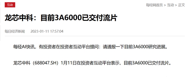 近日,在投資者互動(dòng)平臺(tái)上,有人咨詢關(guān)于3A6000芯片的研究進(jìn)展問題,龍芯中科回復(fù)表示:目前3A6000已交付流片。這說明,國內(nèi)下一代CPU首款芯片,基于自主化設(shè)計(jì),目前已經(jīng)完成了研發(fā)。