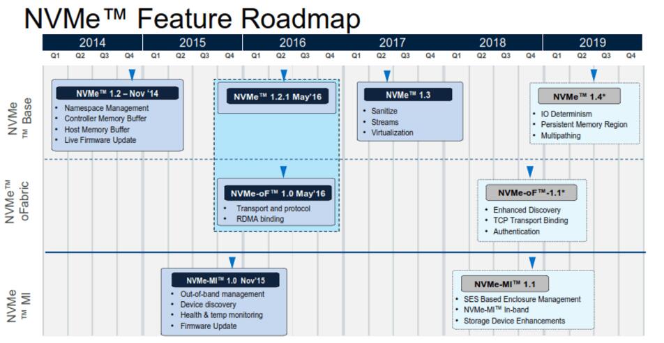 第一個(gè)NVMe規(guī)范逐漸增加了更新的功能——1.2版本中的實(shí)時(shí)固件更新和1.3版本中的清理功能已經(jīng)在SCSI和SATA中很常見了。明年年中推出NVMe 1.4版本將增加IO Determinism功能,以確保跨網(wǎng)絡(luò)和存儲的緊密且一致的延遲。同時(shí),新增的管理規(guī)范也提供了管理設(shè)備機(jī)箱的能力。